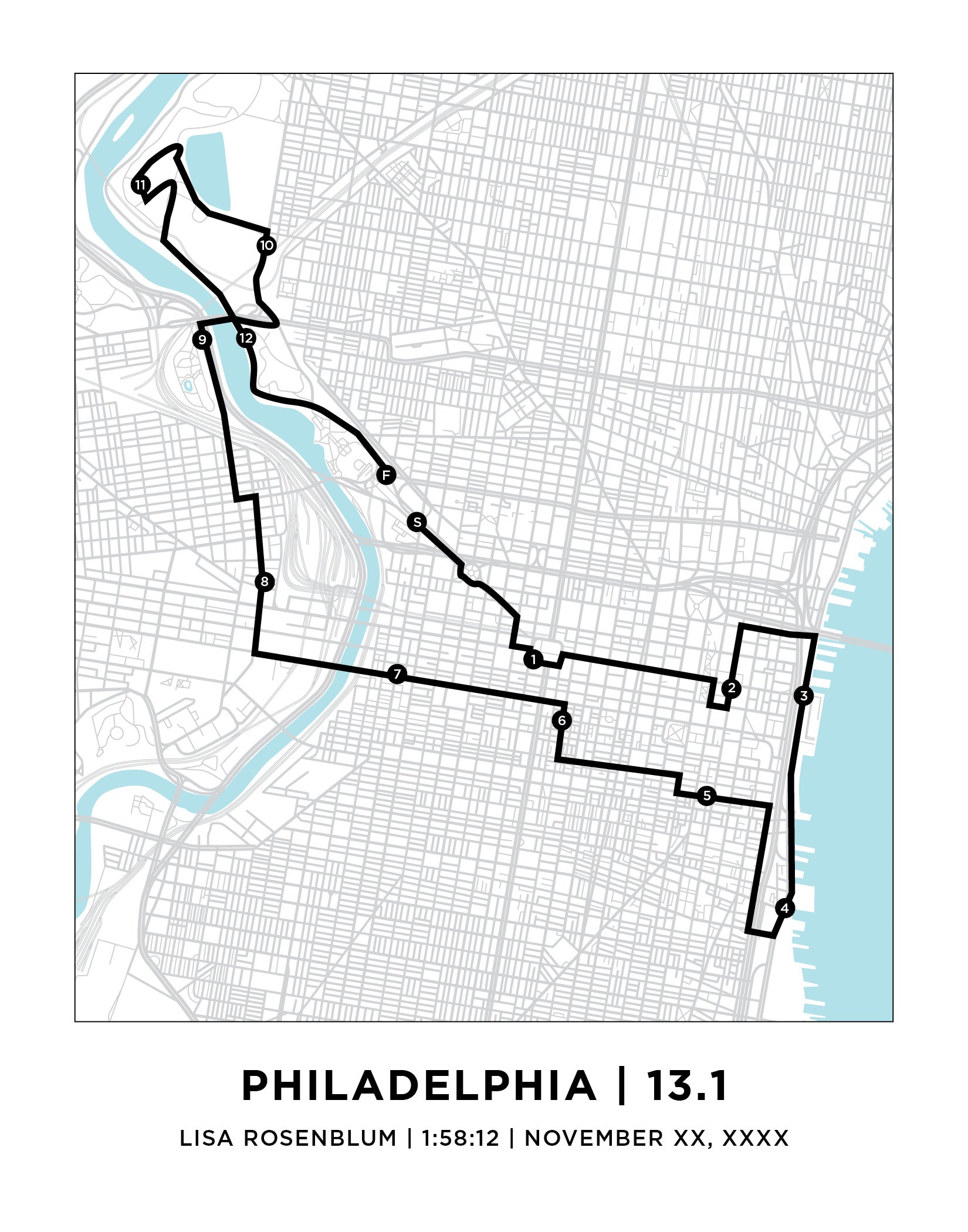 This map is available in 2 different sizes as well as the option to be personalized with your name, time, and date (bib number also can be included).