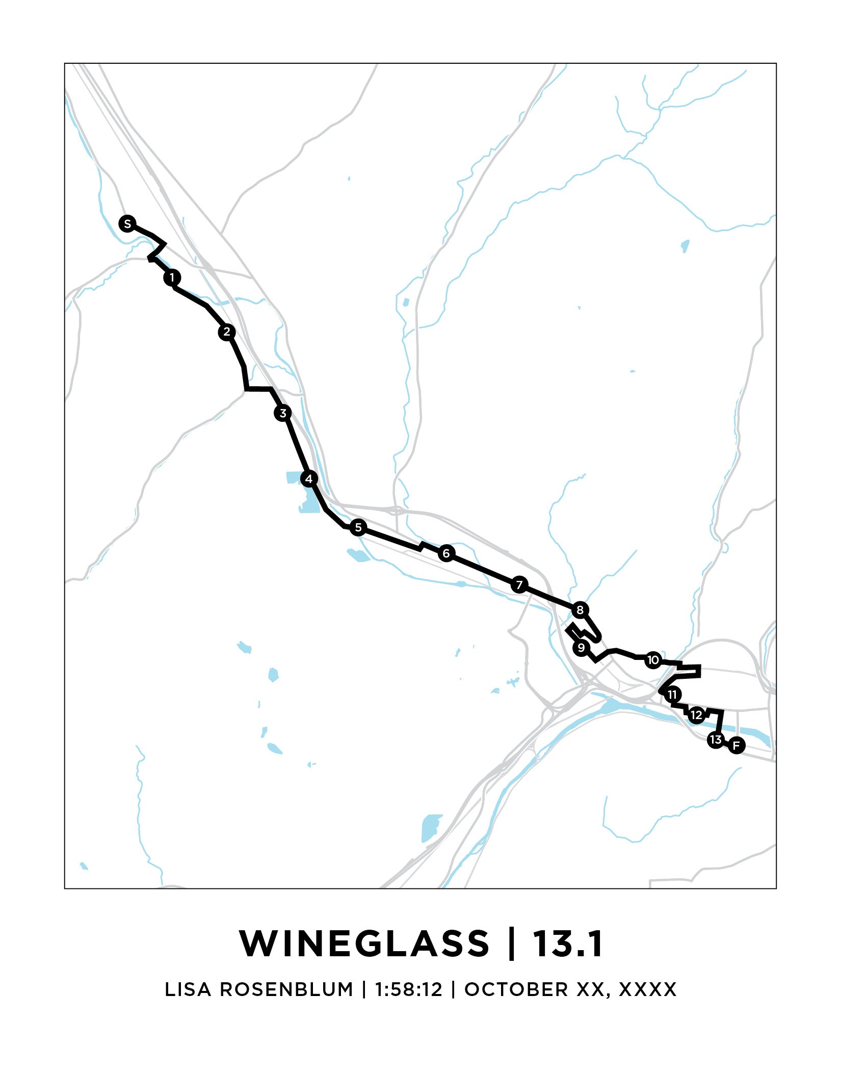 A great way to commemorate your feat (feet!). A perfect gift for any runner. This map is available in 2 different sizes as well as the option to be personalized with your name, time, and date (bib number also can be included).